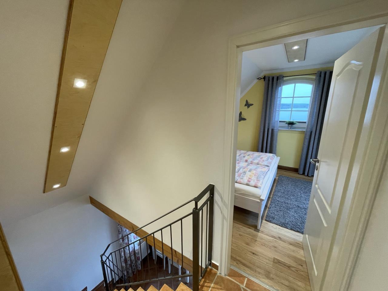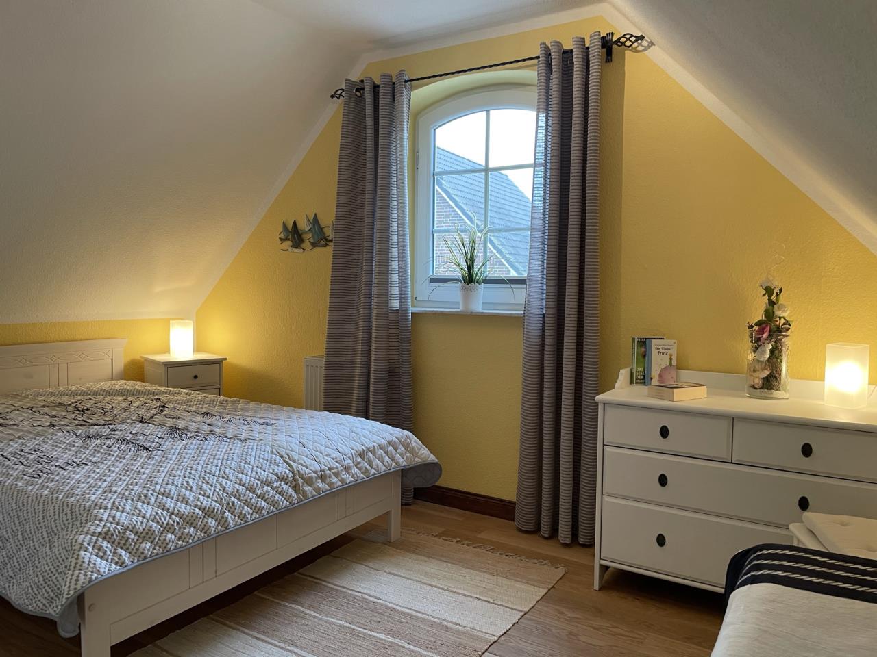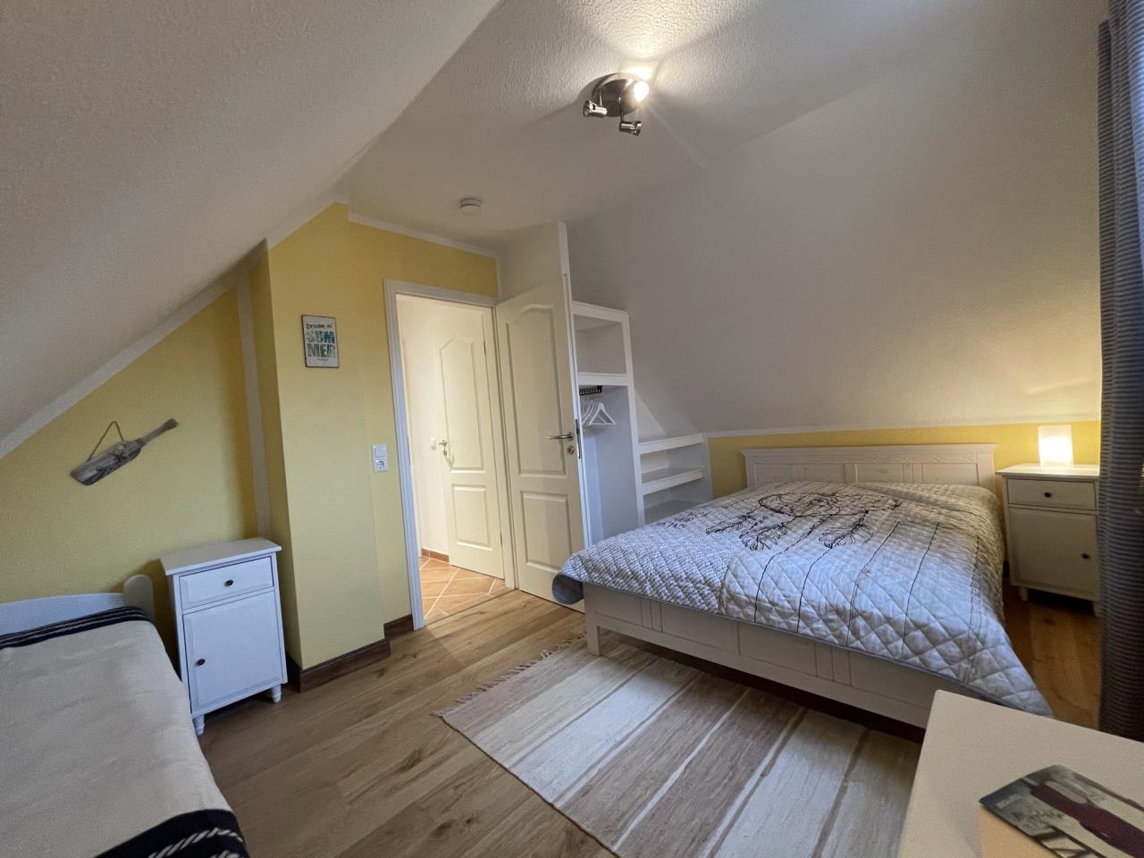 Das liebevoll eingerichtete Haus bietet Platz für bis zu 5 Personen. In der oberen Etage befinden sich zwei gemütliche Schlafzimmer, die in der warmen Farbnote „Ausklang des Sommers“ gestaltet sind, sowie ein kleines Duschbad.