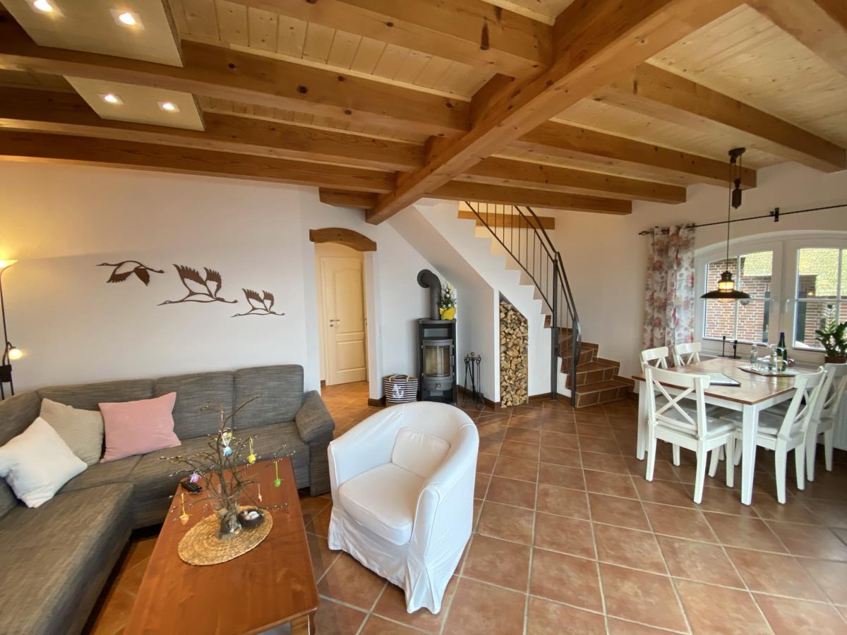 In der unteren Etage erwartet Sie eine voll ausgestattete Küche, die auch im Urlaub keine Wünsche offenlässt. Das angrenzende Wohn- und Esszimmer lädt mit einer bequemen Polstersitzgruppe und einem großen 55“-4K-Smart-TV (inkl. Netflix, Apple TV und Disney+) zum Verweilen ein. Der Essbereich bietet Platz für bis zu 5 Personen. Für besonders gemütliche Abende sorgt der Kaminofen, der wohlige Wärme und Behaglichkeit verbreitet.