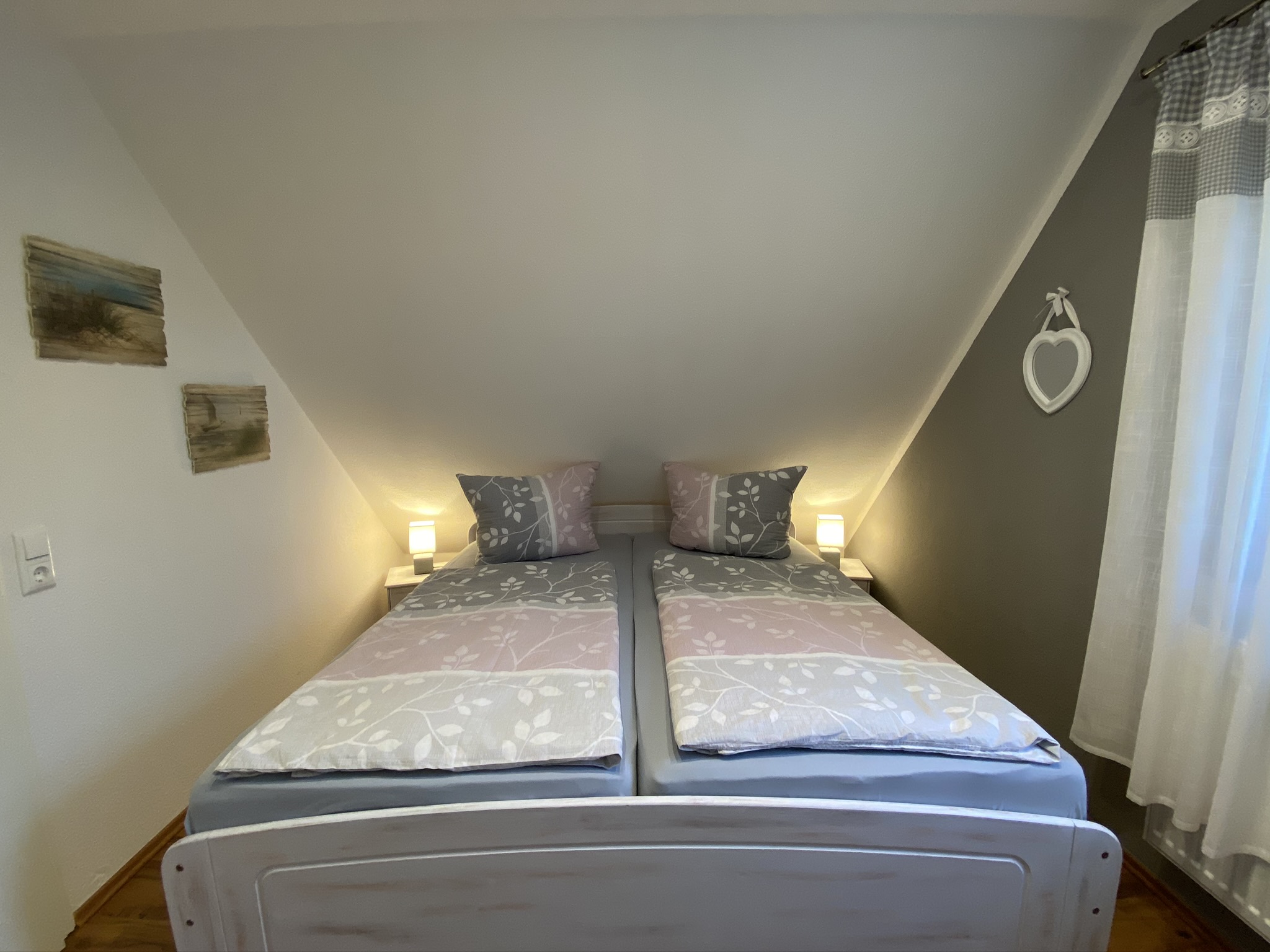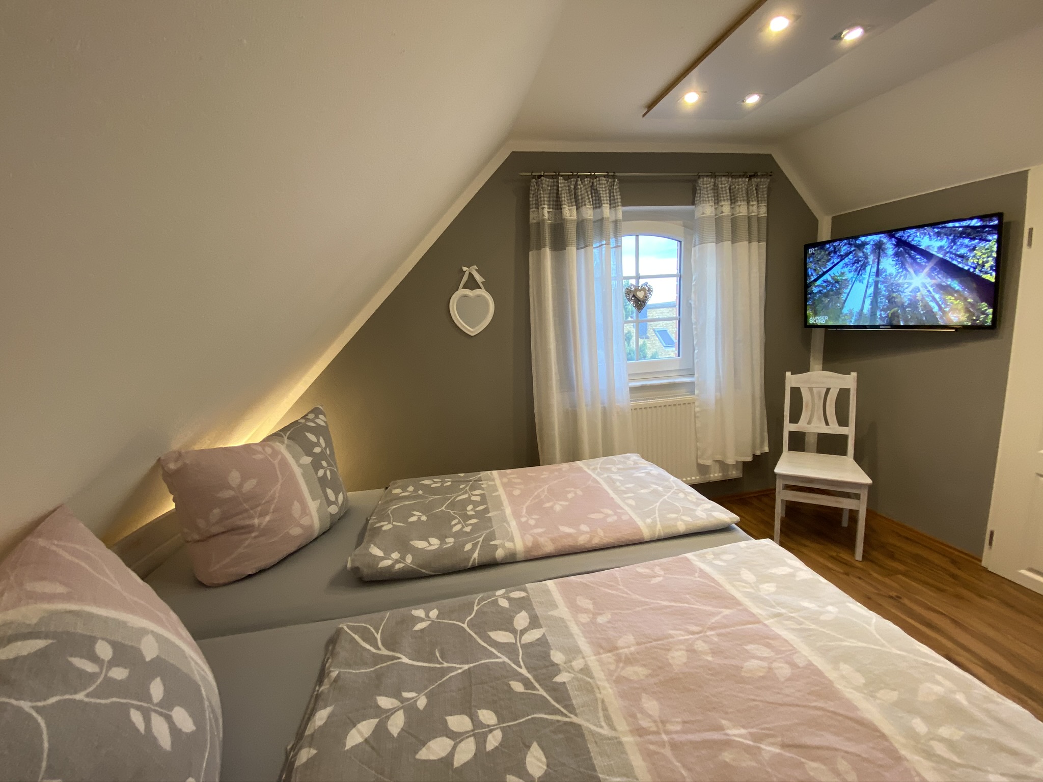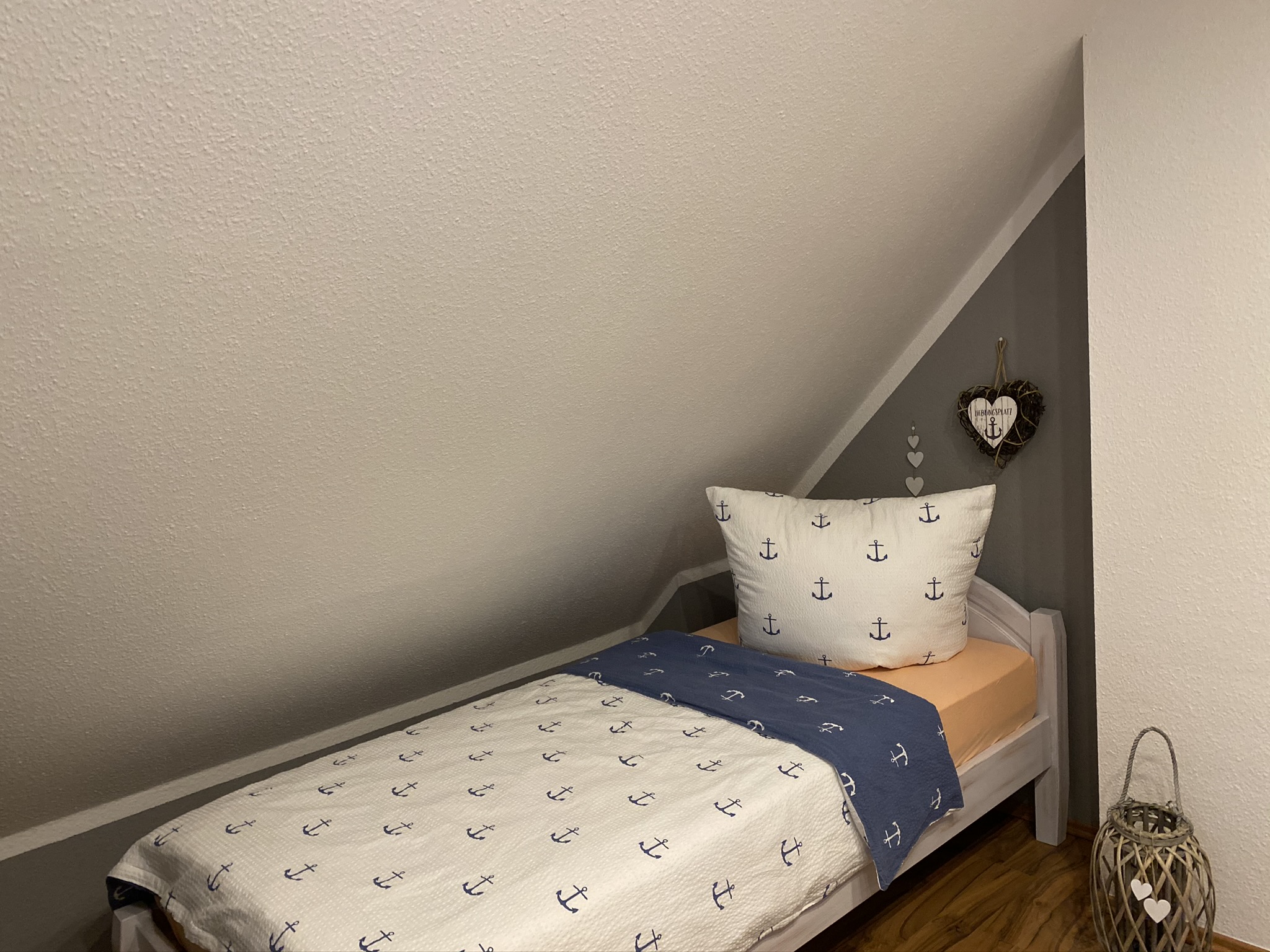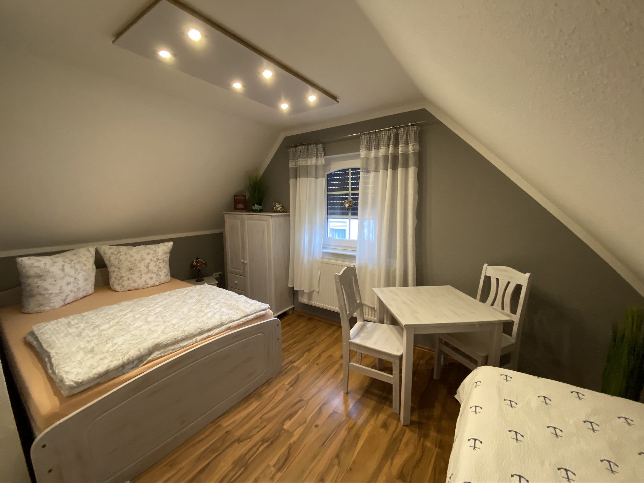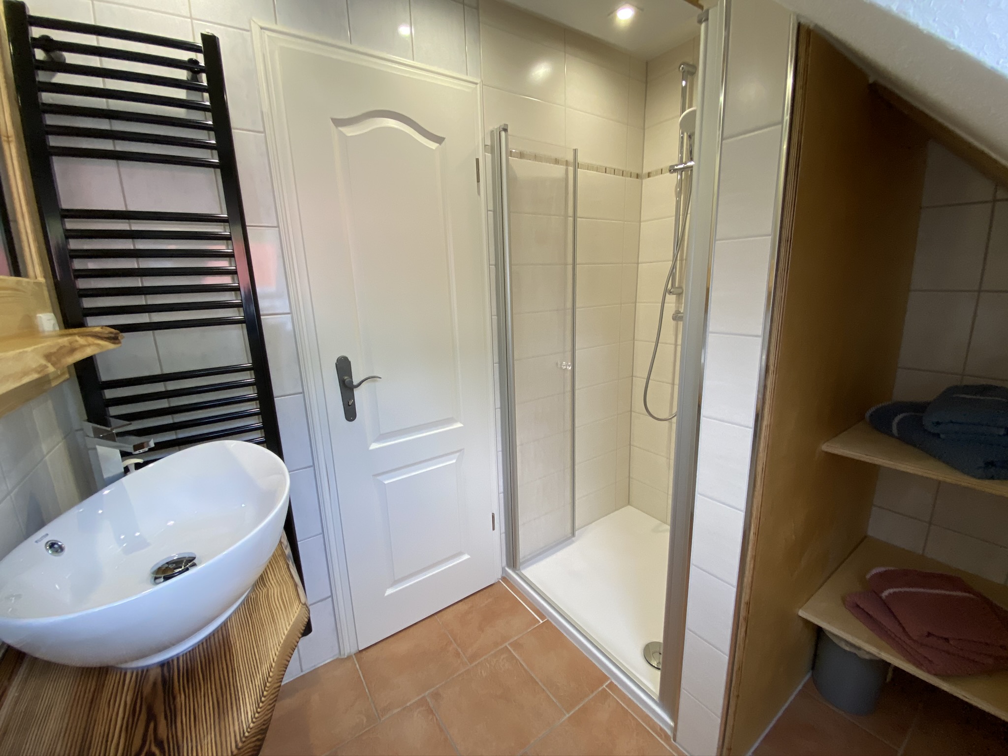 Im Obergeschoss finden Sie ein stilvolles Schlafzimmer mit Doppelbett und ein weiteres Zimmer mit einem Doppelbett sowie einem Einzelbett. Ein kleines Badezimmer mit Dusche sorgt für zusätzlichen Komfort.